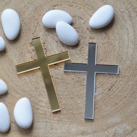 À la fois sobre et délicate, cette croix en acrylique miroir Or ou Argent saura sublimer la pièce montée des mariés ou le gâteau de baptême.